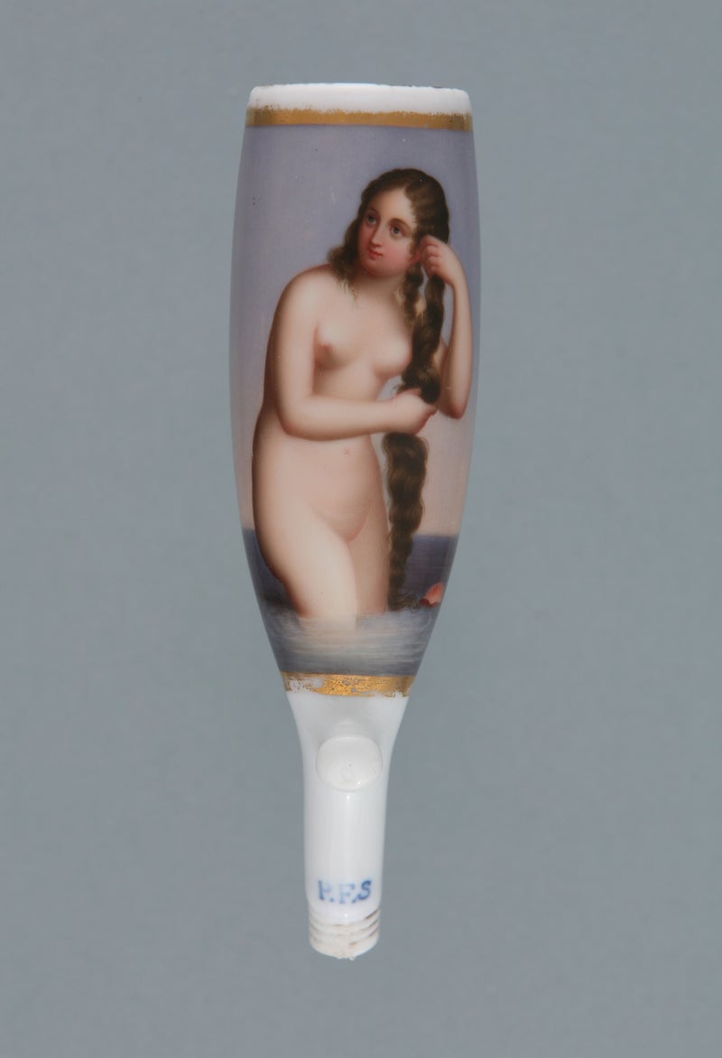The painting is a mirror image after "Venus Anadyomene" (Venus rising from the sea) by Titian, c 1520. The original Titian onced belonged to Queen Christina of Sweden and now hangs in the National Galleries of Scotland.